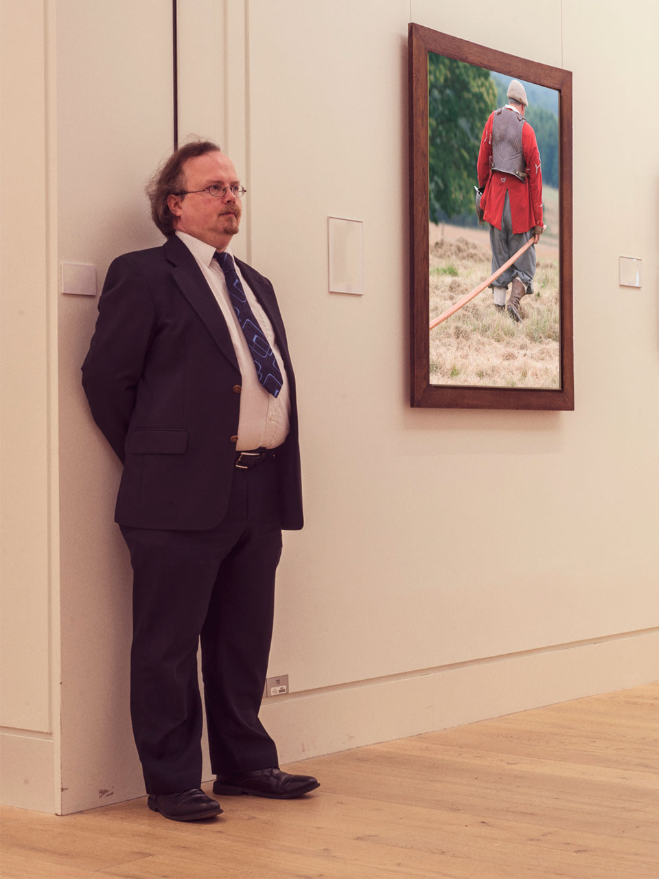 This image examines how the museum removes things from context to create a subjective view of history, using the battle reconstruction (or re-enactment) as inspiration. Incorporating re-enactment photographs taken by the Shire oak photography collective alongside a gallery attendant who is a member of the collective, the work explores the nature of the photographic and performative reconstruction in relation to the historical truth of the museum.